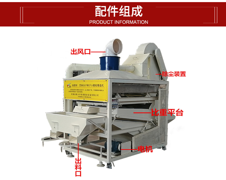 該機按物料大小、重量或外形輪廓的差異進行風選和比重篩選相結合的谷物清選設備。該機采用正壓的方式,利用氣流和振動摩擦對物料產(chǎn)生的綜合作用,比重較大的物料沉降到底層,通過篩面的振動摩擦向高處移動,比重較小的物料經(jīng)氣流作用則懸浮在料層的表面向低處流動,以達到按比重分離的目的。該機能有效剔除物料中的雜質【霉爛變質粒、蟲蛀粒、黑粉病粒、秕谷粒、芽谷粒、大重雜、小重雜、粉塵等】。該機廣泛用于玉米、小麥、水稻、決明子、大豆、蔬菜等農(nóng)作物種子和形態(tài)的草籽,如牧草種、園藝種、林木種等種子的清選加工。