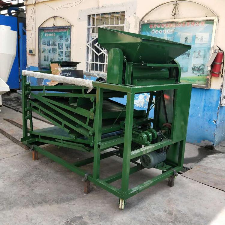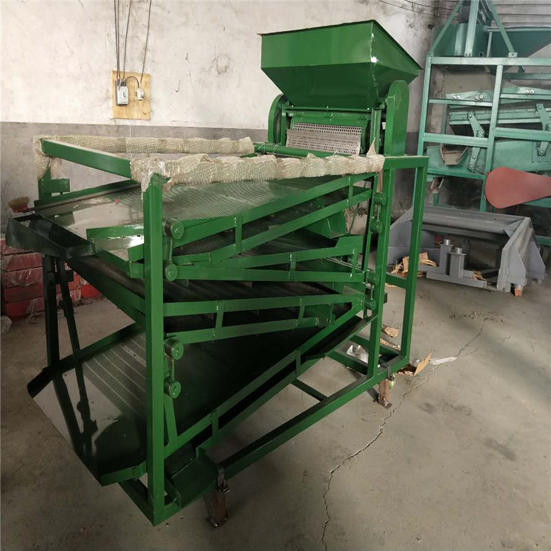 將花椒放入進(jìn)料口---------進(jìn)料口下方有一個(gè)分離器將花椒耙籽殼分離開--------分離的混合物料落入回旋篩--------回旋篩分為3層-------一層出料霉花椒、花椒葉、花椒枝-----一層復(fù)式篩網(wǎng)篩的是花椒枝----------二層為花椒枝出料口-------復(fù)式篩網(wǎng)為花椒籽出料口--------花椒籽出來時(shí)有風(fēng)機(jī)可以增加花椒籽的凈度。提高花椒凈度---------底層出來的是花椒殼